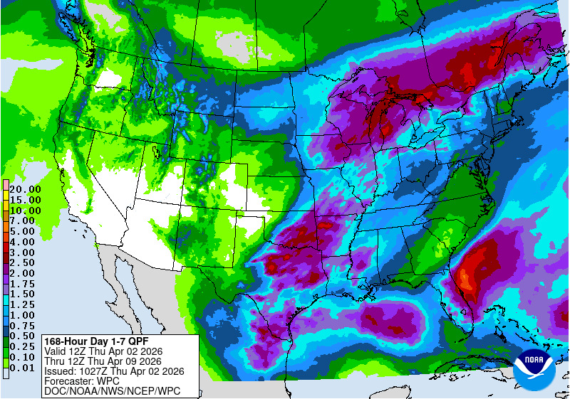 Figure 2. Total precipitation amounts (in inches) predicted for April 2-9, 2026.
