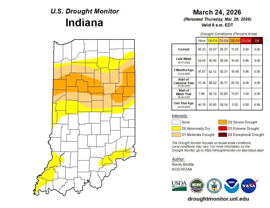 Indiana has exceeded its previous maximum duration record of 46 weeks in drought (since May 20, 2025) since the U.S. Drought Monitor (USDM) began in 2000. The previous record was 44 consecutive weeks.  This was a bit of a surprise when I saw it, since it includes the 2012 drought and multiple other drought periods in recent years.  Forty-four weeks (the previous record) isn’t even a full year!  As our statewide drought team meets weekly and conditions have been slowly improving in that northern band of dryness, most of this area has been missing out on the multiple rain events that locations south of I-70 have seen.  Things seem to be turning around, though, where the D3 locations (defined by the USDM as “Extreme Drought”) have gradually improved to D2 (“Severe Drought”; see Figure 1), and perhaps next week those D2 areas can improve even further to D1 (“Moderate Drought”).