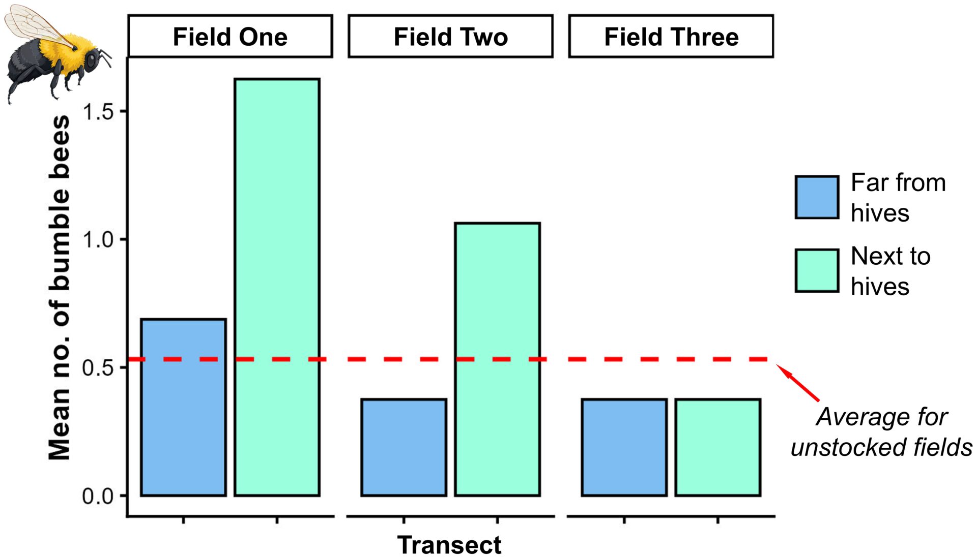 Figure 3. Mean number of bumble bees recorded per 5-min observation in transects far from hives or next to hives in each of the three fields that were stocked with managed bumble bees. The red dashed line indicates the mean number of wild bumble bees recorded across the non-bumble bee-stocked fields.
