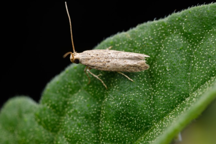 As the growing season picks up, high tunnel growers planning to cultivate tomatoes should keep an eye out for the small but mighty tomato pinworm, Keiferia lycopersicella (TPW). The adult moths are up to 6 mm in length, with mottled brown spots (Fig. 1). They are active at night and remain hidden, resting on foliage during the day and are rarely seen. TPW primarily feeds on tomato plants but has occasionally been reported on other plants within the Solanaceae family, including but not limited to peppers, eggplant, and potatoes. The adults do not feed on tomatoes at all, but their larvae feed voraciously on the leaves. They create characteristic blotchy leaf mines and prefer leaf material, but may burrow into plant stems and fruits if leaves are too damaged.