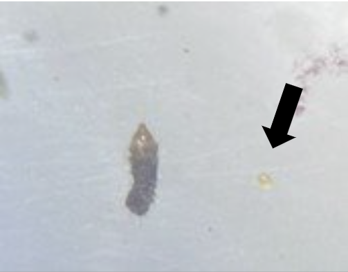 Figure 2. Tomato pinworm egg on the right, dead larva on the left. The egg is approximately 0.4 mm in length; you will likely never see them on your plants (Photo by Sydney Territo).