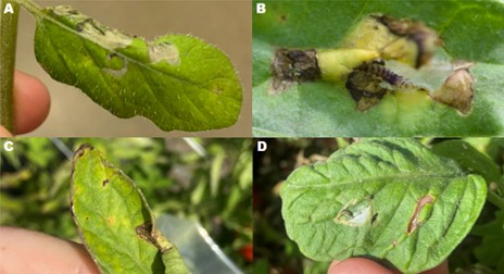 Figure 3. Tomato pinworm damage based on their life stage. Early instar larvae create small, winding mines (A) that become larger and blotchier as the larvae feed and grow (B). Late instar larvae curl leaves (C) using webbing, or may just use only webbing as a protective layer (D). All images except B taken by Sydney Territo. Image B taken by Hunter Roy.